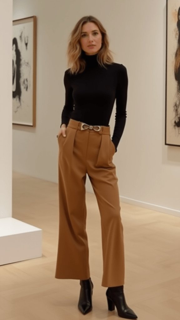A turtleneck bodysuit tucked into wide-leg pants creates a long, lean silhouette that’s perfect for those “I mean business” days.
