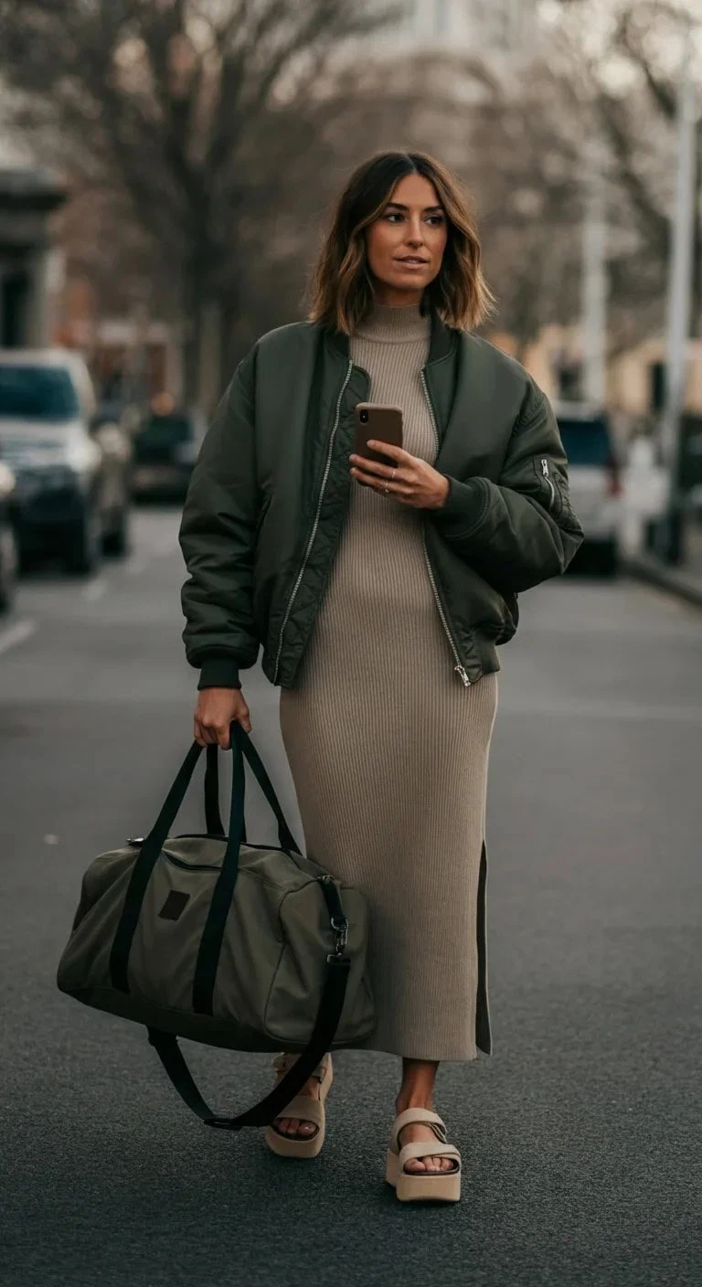 Knit Column Dress with Bomber Jacket