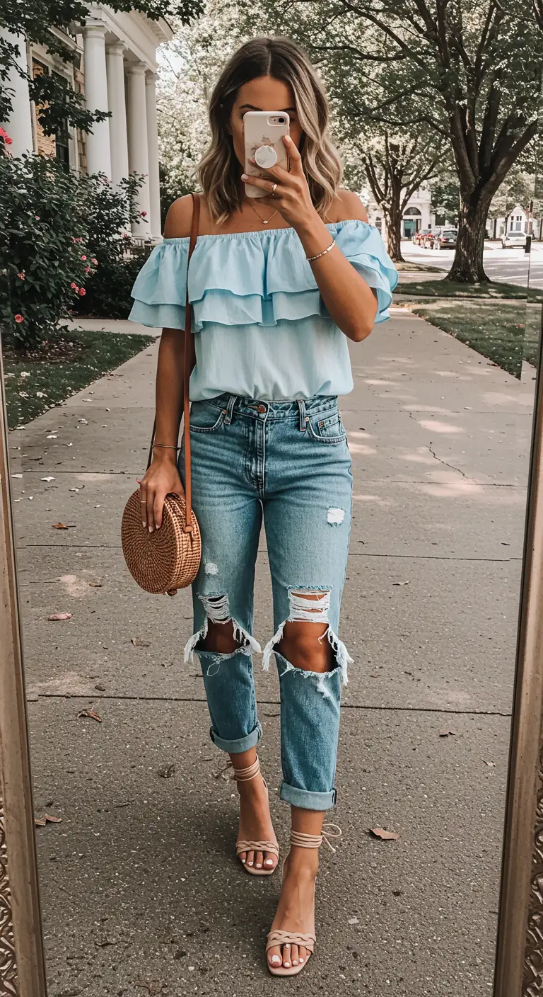 An off-shoulder top brings a romantic, feminine touch to any outfit.