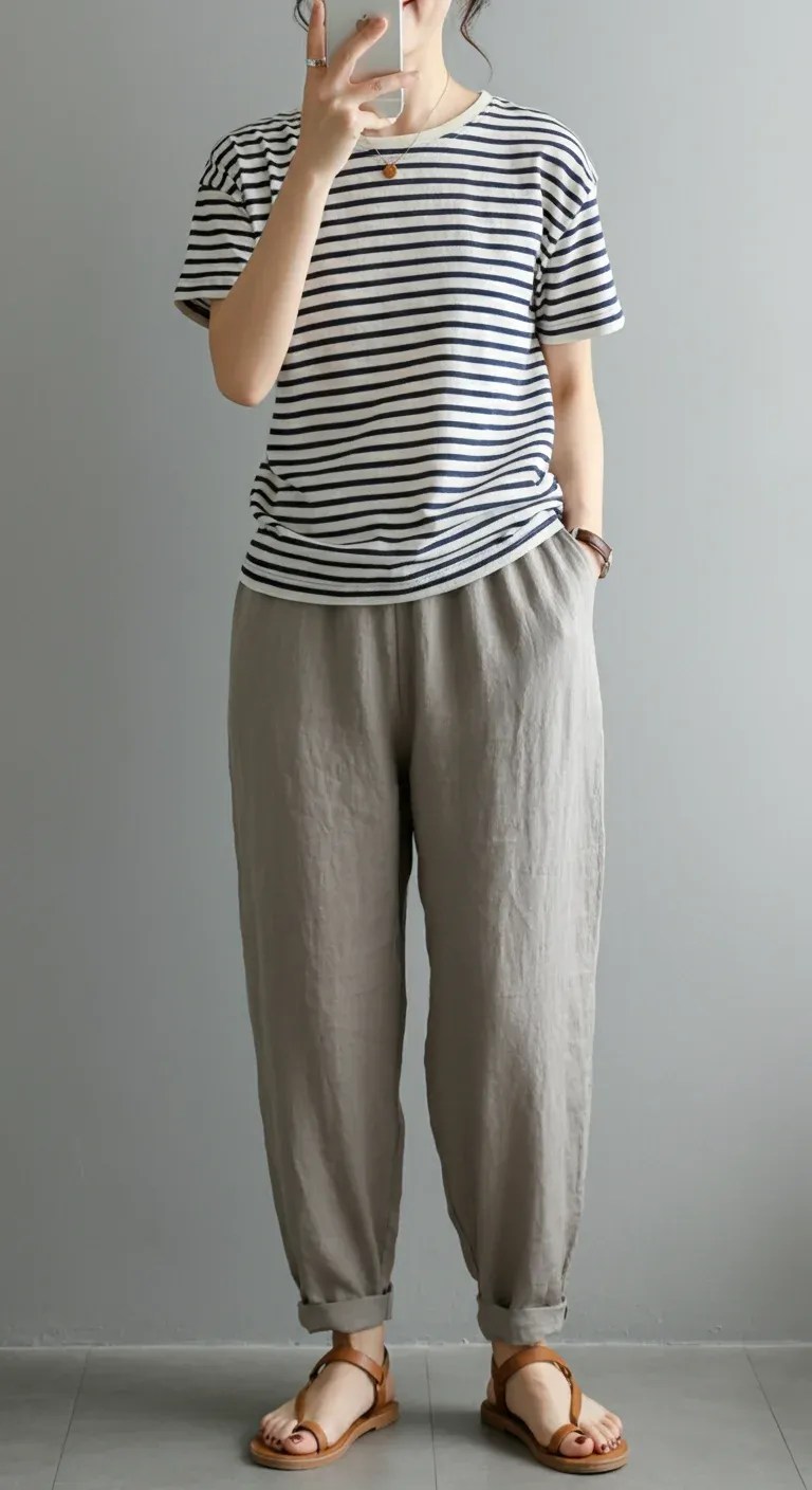 A striped tee paired with linen pants is a timeless summer look that combines comfort with nautical-inspired chic.