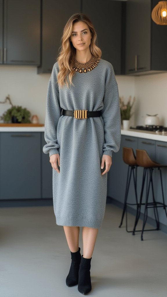 A cozy sweater dress is like socially acceptable loungewear. Add a statement necklace and suddenly you re dressed up. Pair with tights and ankle boots for extra warmth.