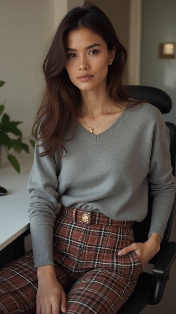 High-waisted plaid trousers paired with a soft cashmere sweater create a look that s both polished and cozy. Add some loafers or pumps depending on your mood (or how much coffee you ve had).