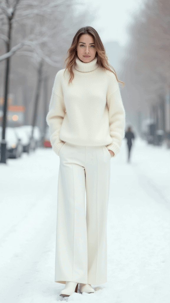 A chunky white turtleneck paired with crisp white trousers creates a sleek silhouette that s both cozy and chic.