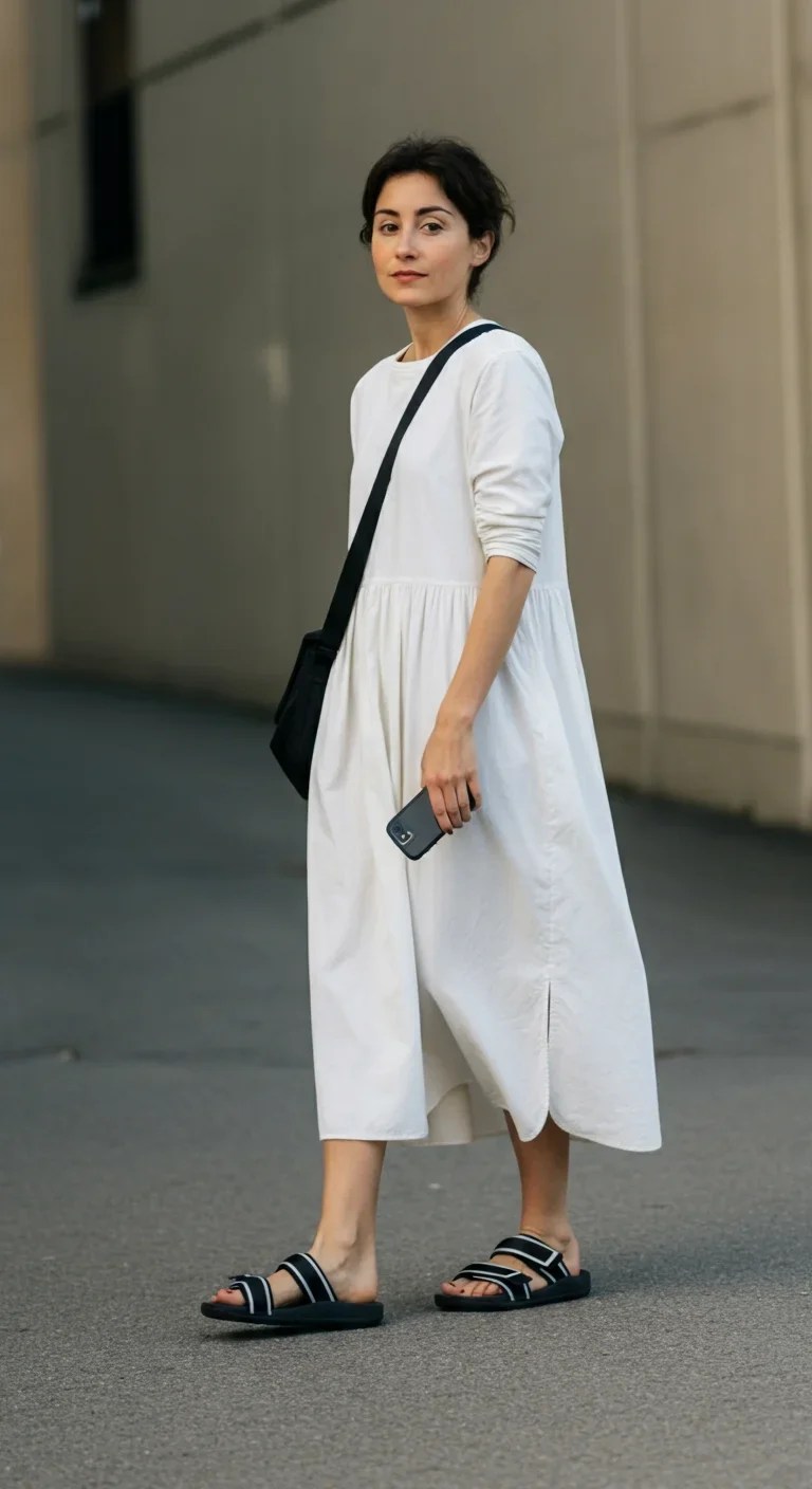 The combination of a flowing dress with sporty sandals creates an unexpected modern look.