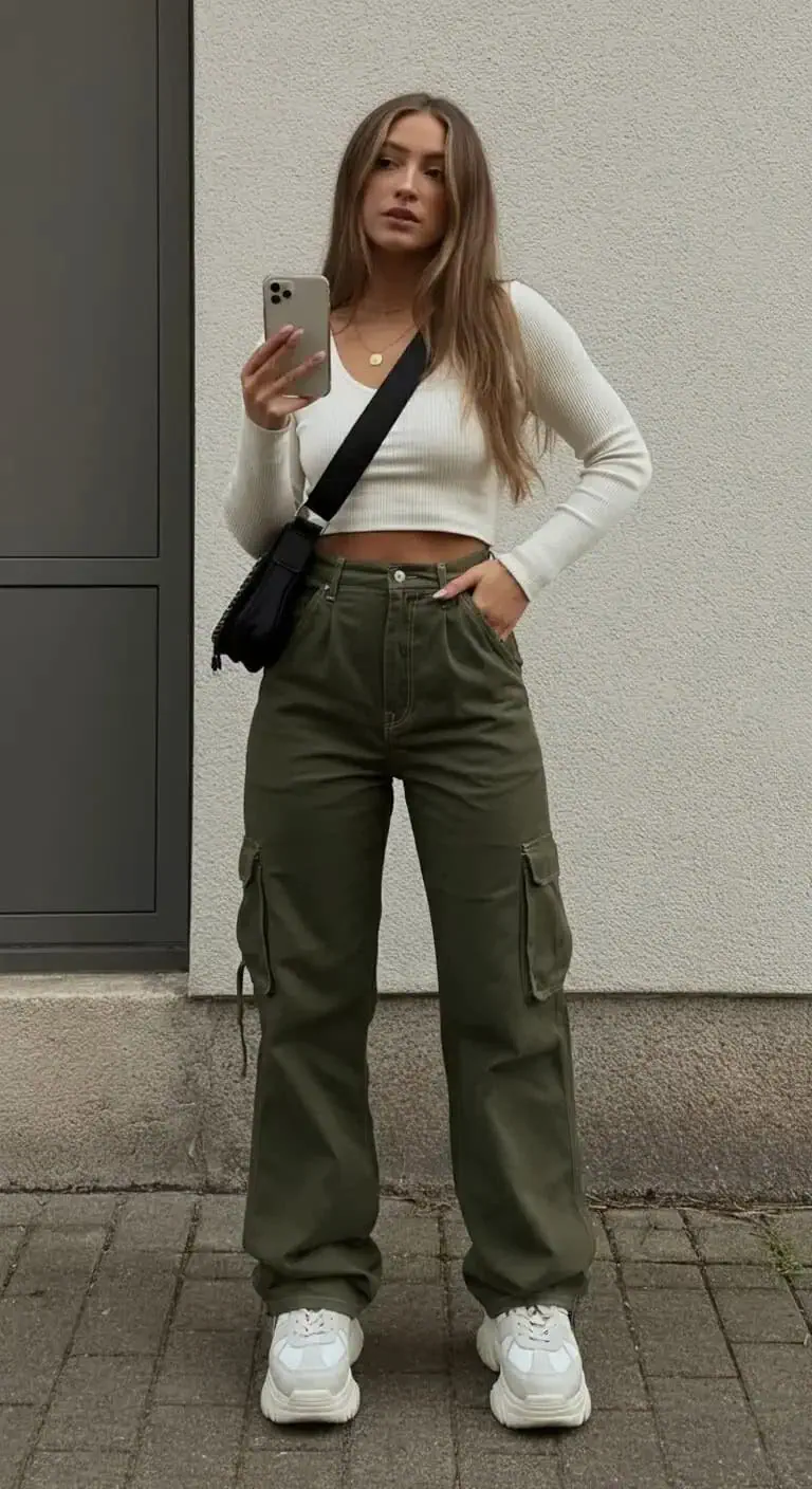 High-waisted cargo pants offer both style and function.