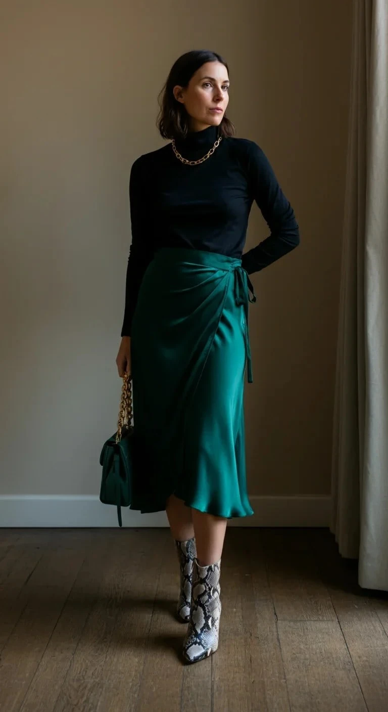 Embrace luxurious textures with a silk wrap midi in jewel tones.