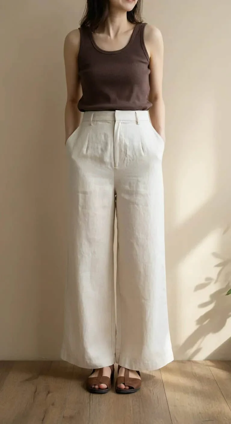 The flowing silhouette of wide-leg pants creates an elongated look.