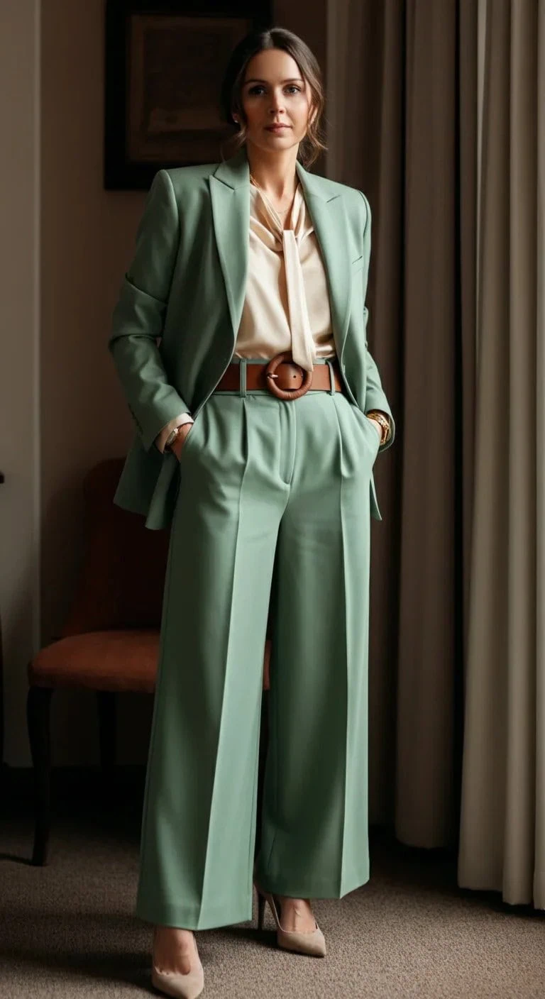A matching blazer adds structure, while the cream silk blouse softens the look.