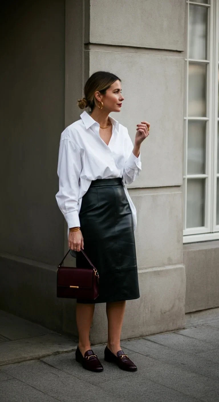 Oversized Shirt with Leather Pencil Skirt