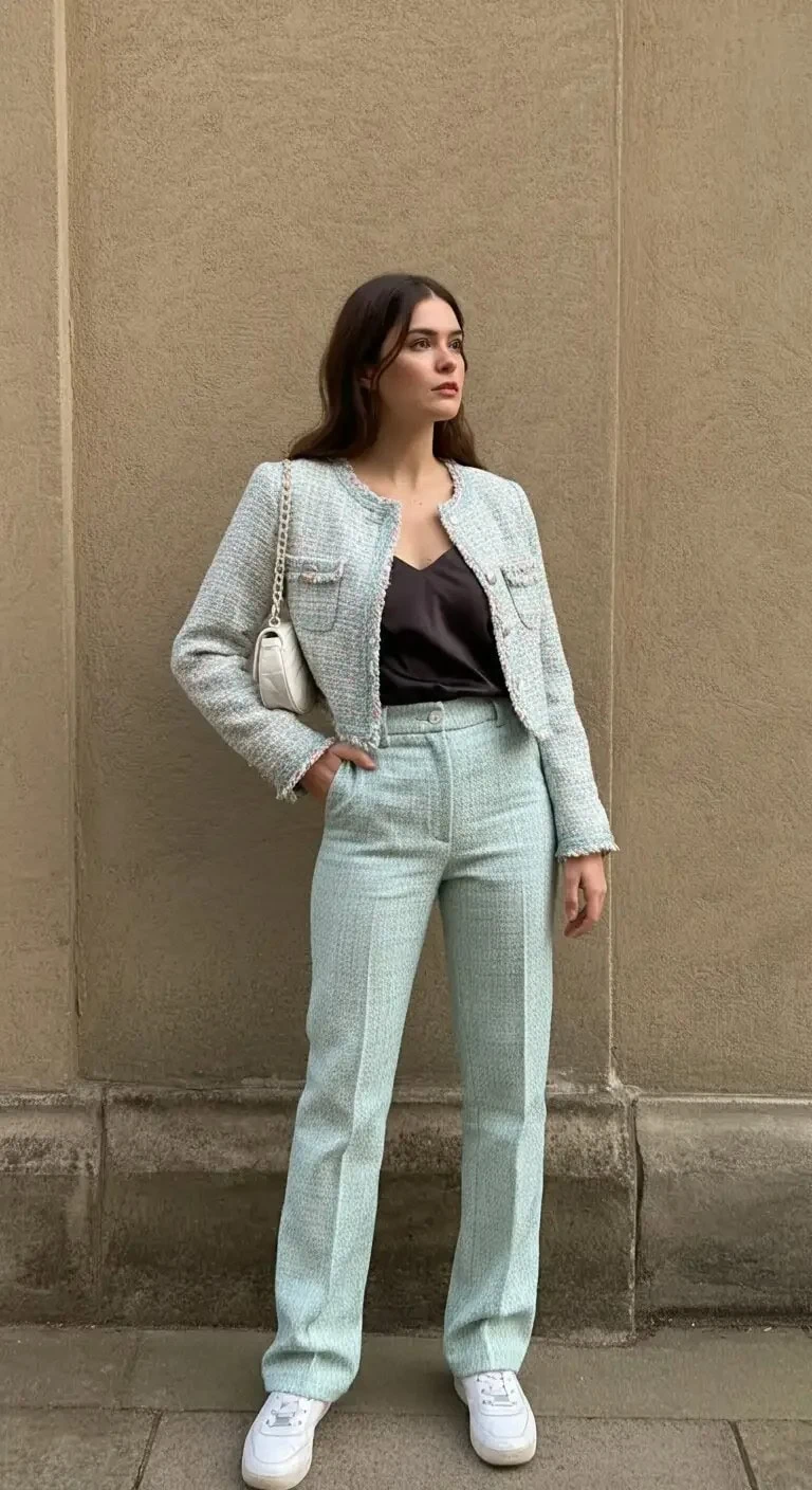 The cropped jacket paired with high-waisted pants creates modern proportions.