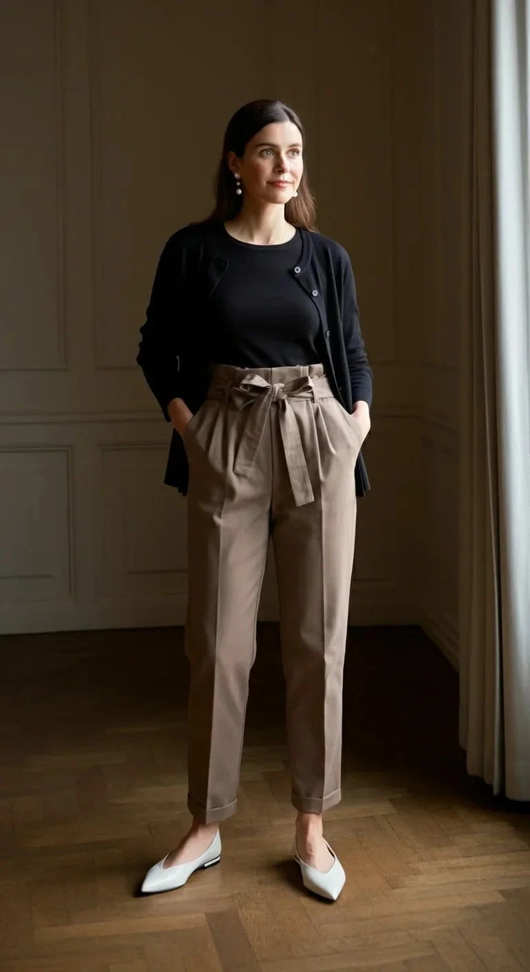 Paperbag Waist Pants with Fitted Cardigan