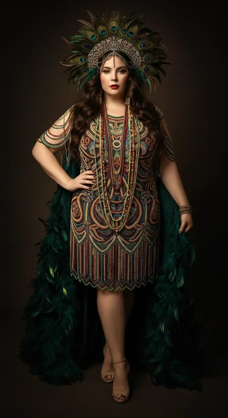 Complete with art deco jewelry and a feather boa.