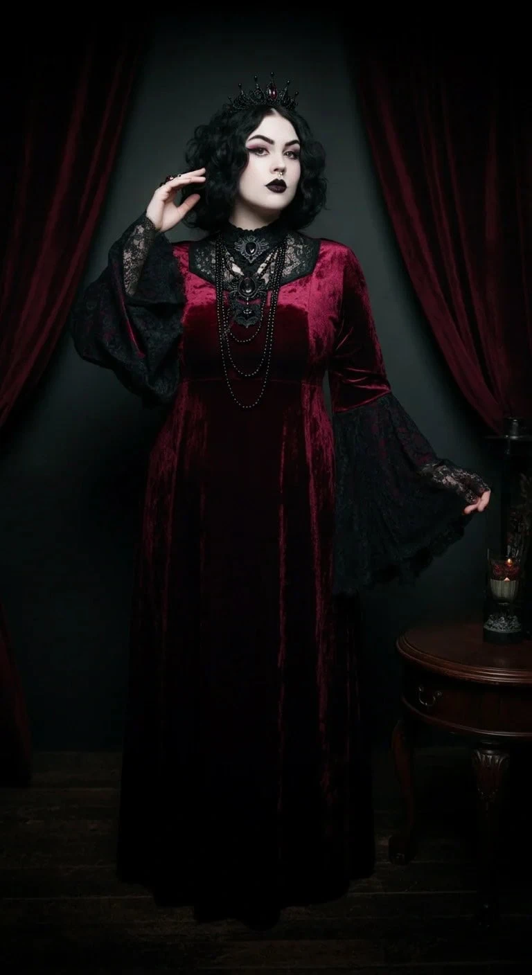 Complete the look with a small crystal tiara, gothic choker, and deep burgundy lipstick.