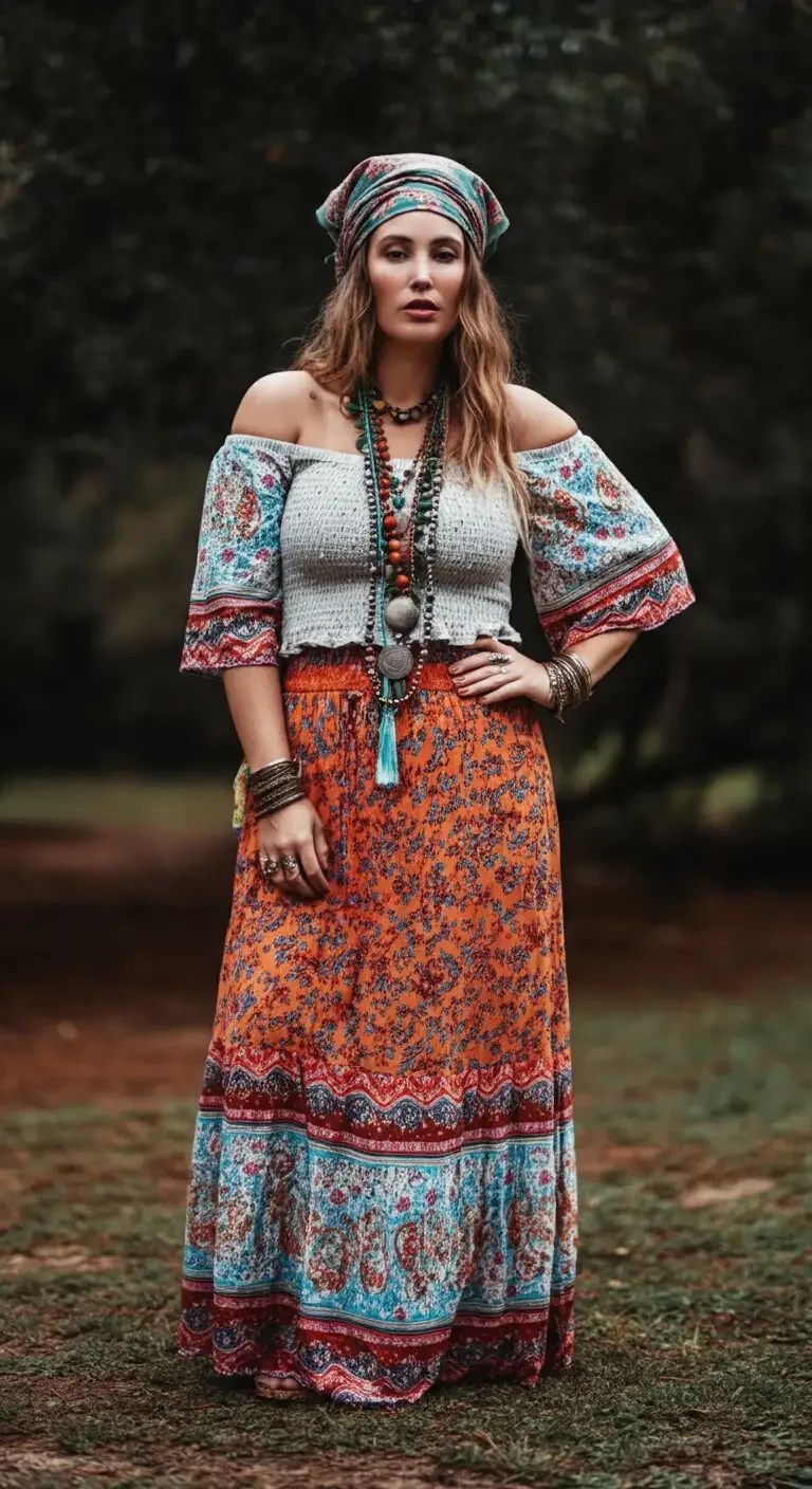 Layer a vibrant maxi skirt with an off-shoulder peasant top.