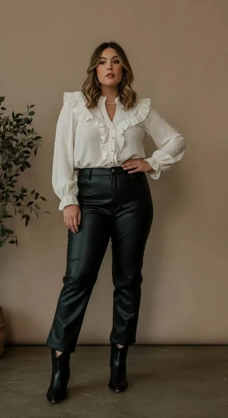 High-Rise Leather Pants and Ruffled Blouse
