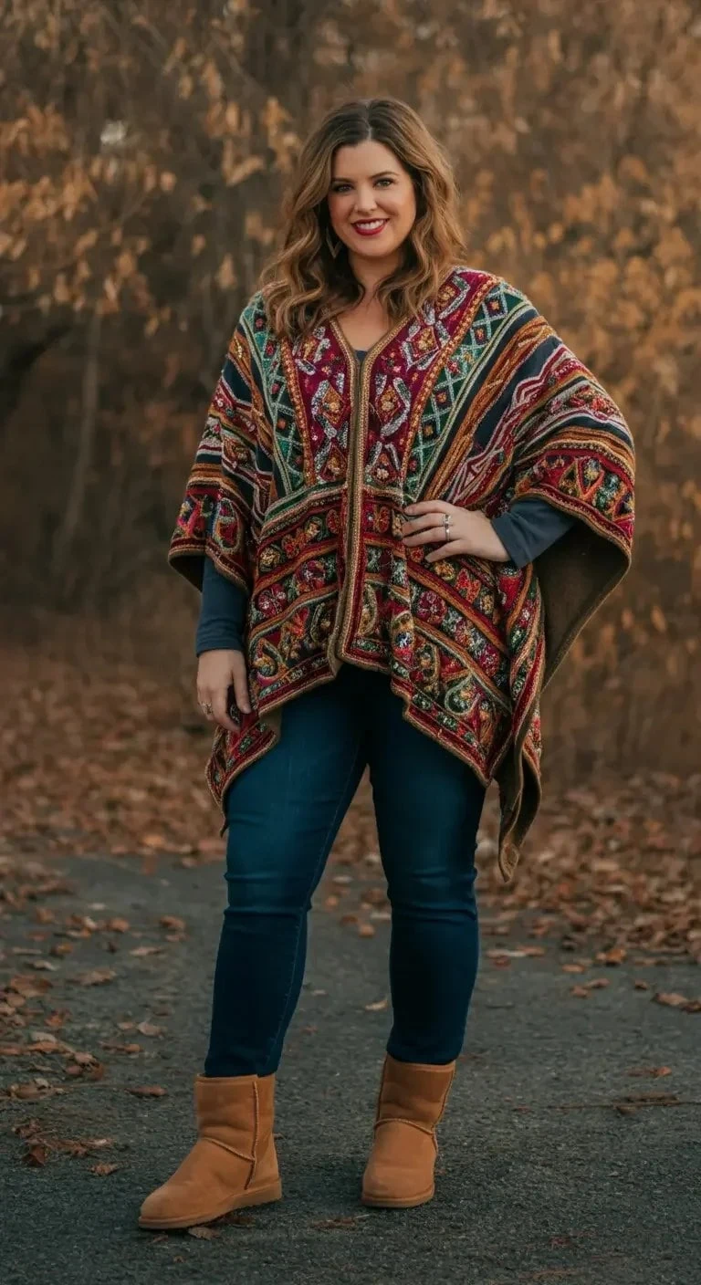 Embellished Poncho and Fitted Jeans