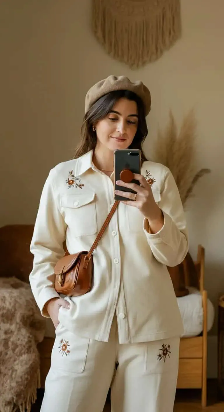 Add a structured leather crossbody bag in cognac brown for practical elegance.
