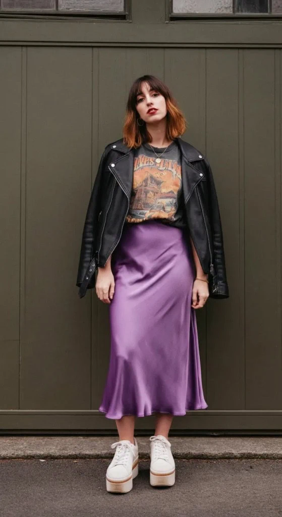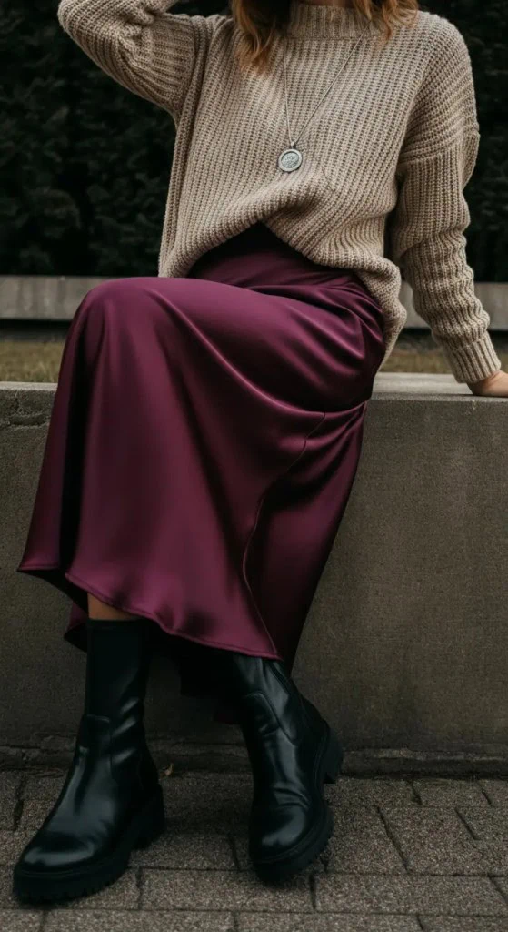 Choose a plum-colored satin skirt for rich autumn vibes.
