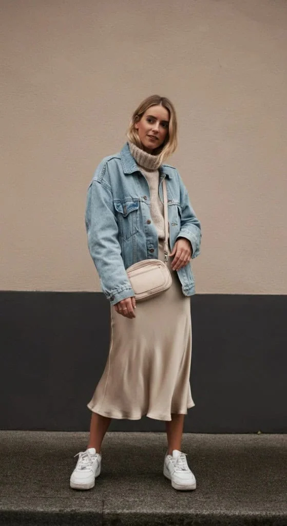 Break the formality with an oversized denim jacket over a champagne satin midi skirt.