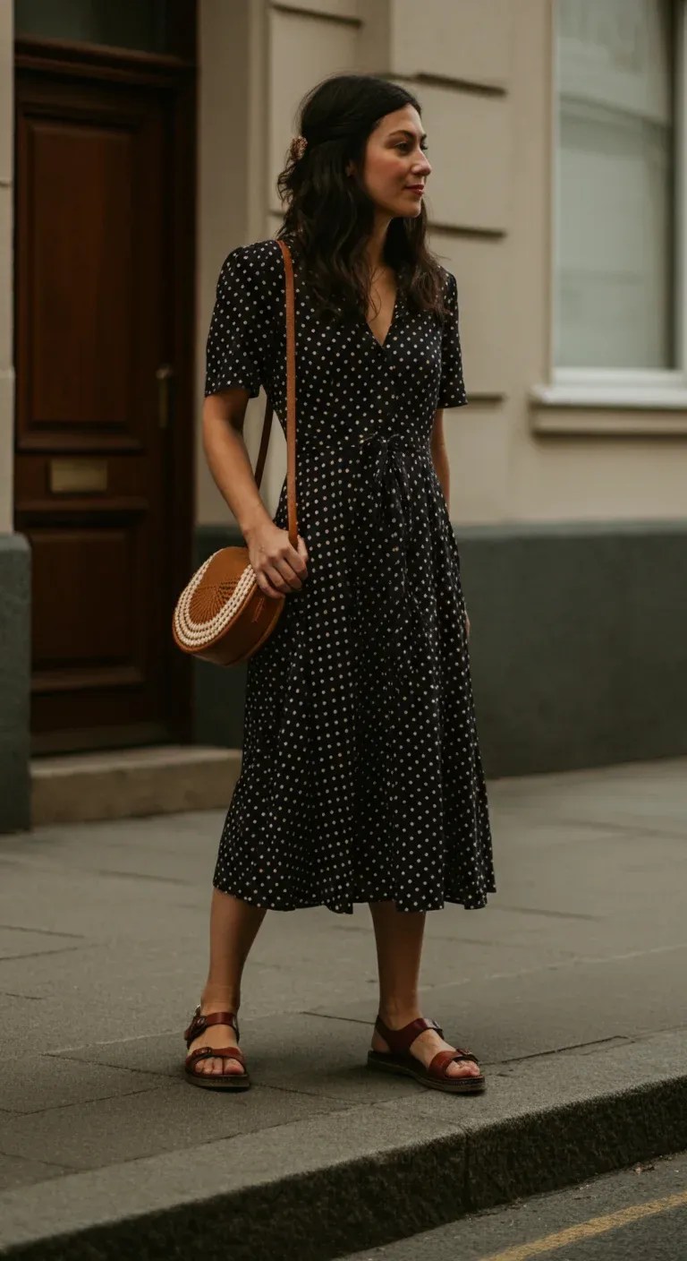 Add a touch of whimsy to your wardrobe with a polka dot midi dress. Pair it with vintage-style sandals for a charming, retro-inspired look.