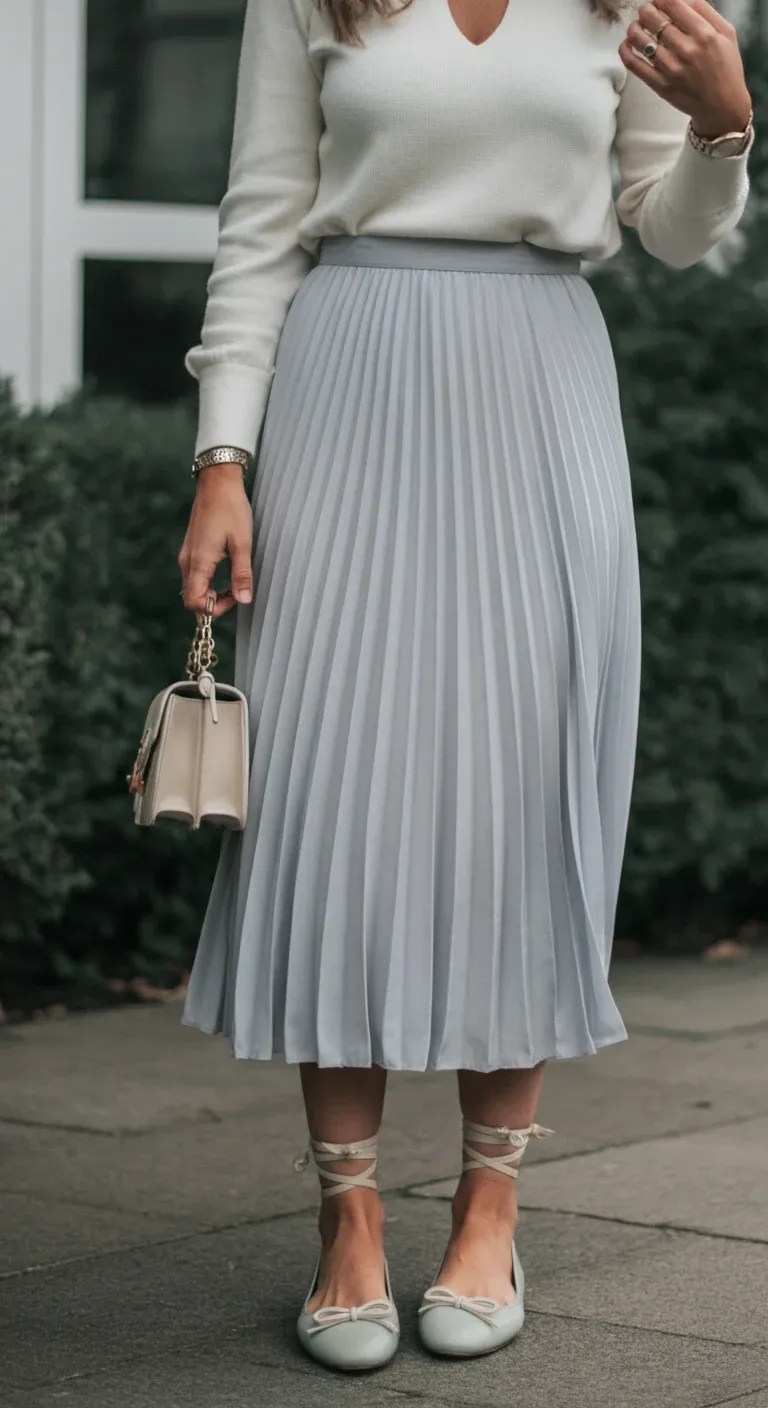 Dress to impress in a much-loved classic, the pleated skirt. Keep it light and breezy with a pastel shade, pairing it with a white blouse and strappy flats.
