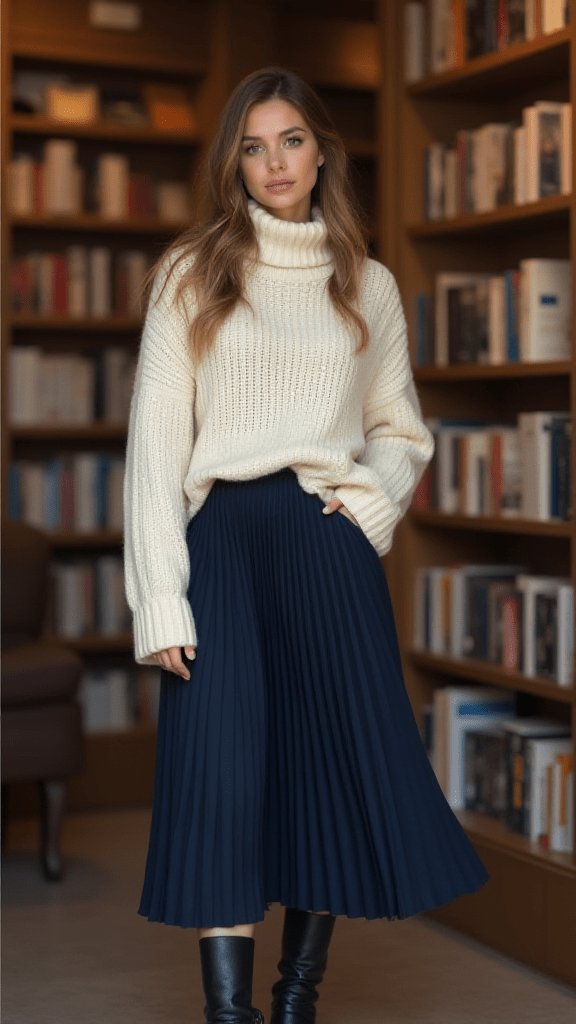 This look is like a warm hug for your style. The chunky turtleneck brings the cozy, while the pleated midi skirt adds a touch of elegance.