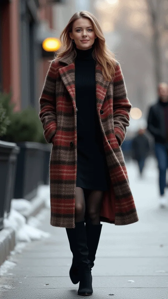 Plaid Coat and Turtleneck Dress