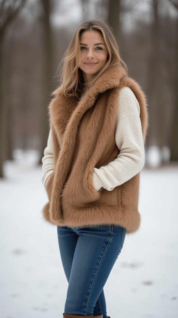 Who says you can t be a snow bunny in the city? This look combines the coziness of a faux fur vest with the practicality of skinny jeans.
