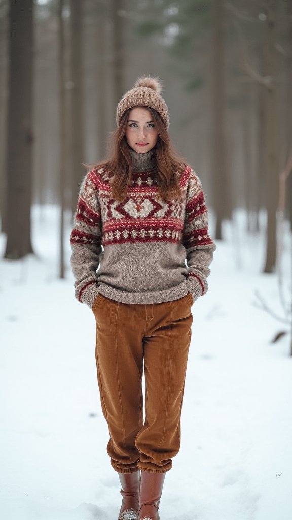 Embrace your inner ski lodge chic with this playful combo. The Fair Isle sweater brings a touch of whimsy, while the corduroy pants add texture and warmth.