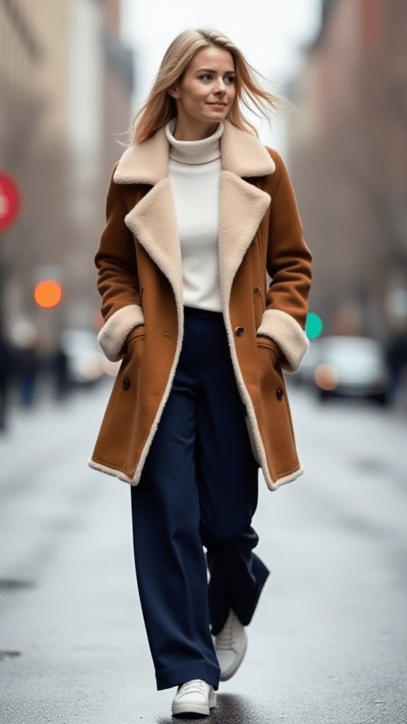 Ready to feel like you re wrapped in a cloud? This shearling jacket and wide-leg pants combo is your ticket to comfort heaven.