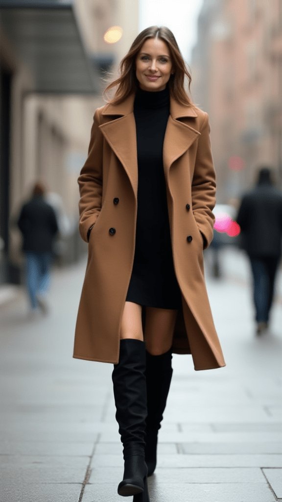 Feel like a movie star in this timeless ensemble. The wrap coat cinches at the waist for a flattering silhouette, while the knee-high boots add a touch of drama.