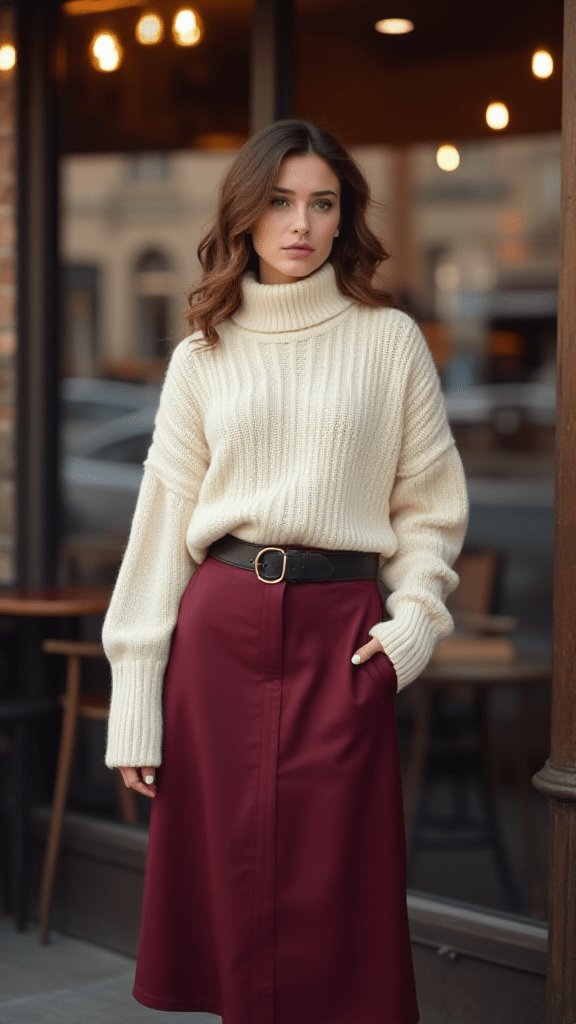 Tuck a chunky turtleneck into a flowy midi skirt for a look that s both cozy and elegant. Add some knee-high boots and a belt to cinch your waist, and you re good to go.