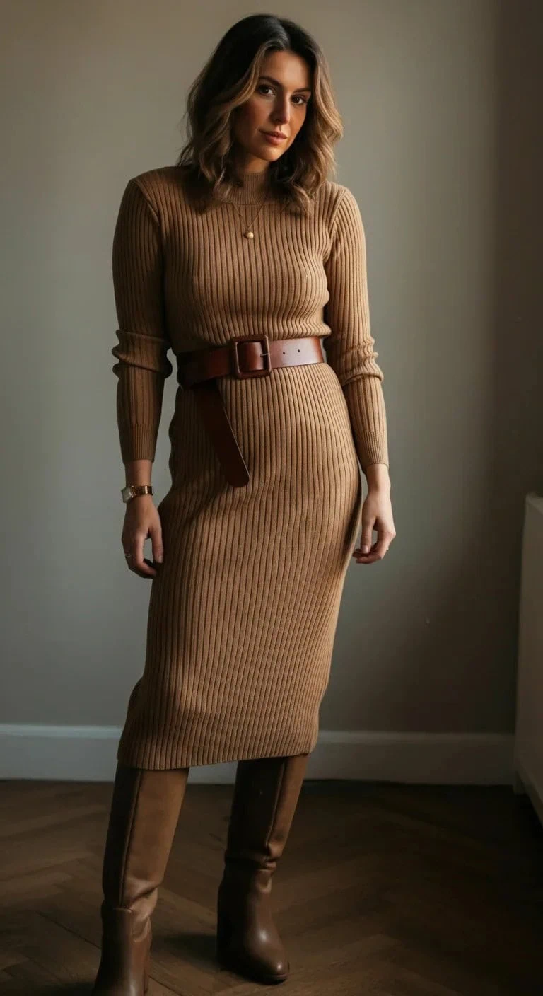 A fitted knit dress becomes instantly more professional with a statement belt.