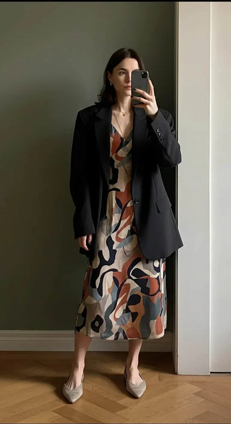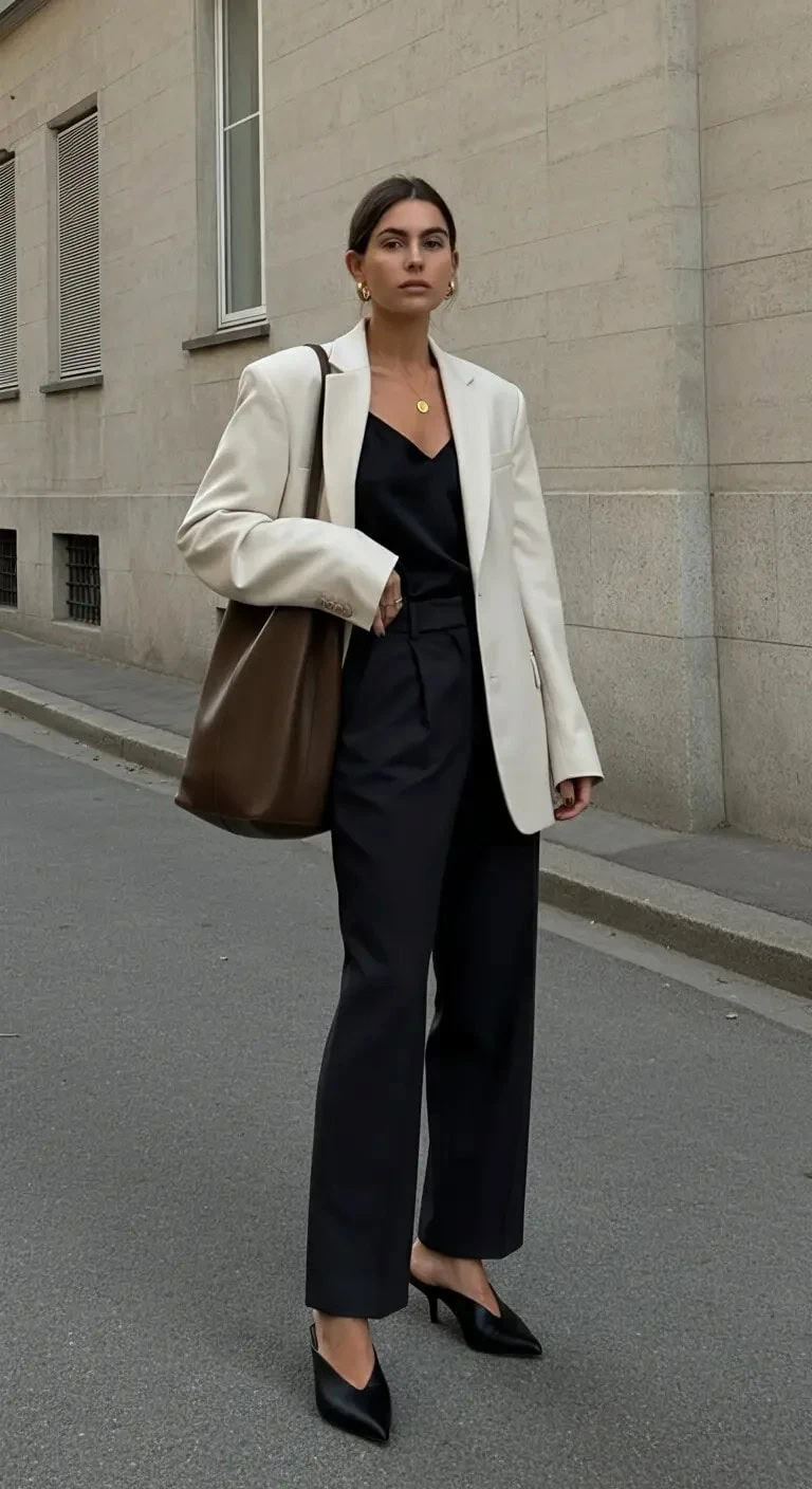 The sophisticated layering of a silk camisole under a well-cut blazer creates an elegant silhouette.