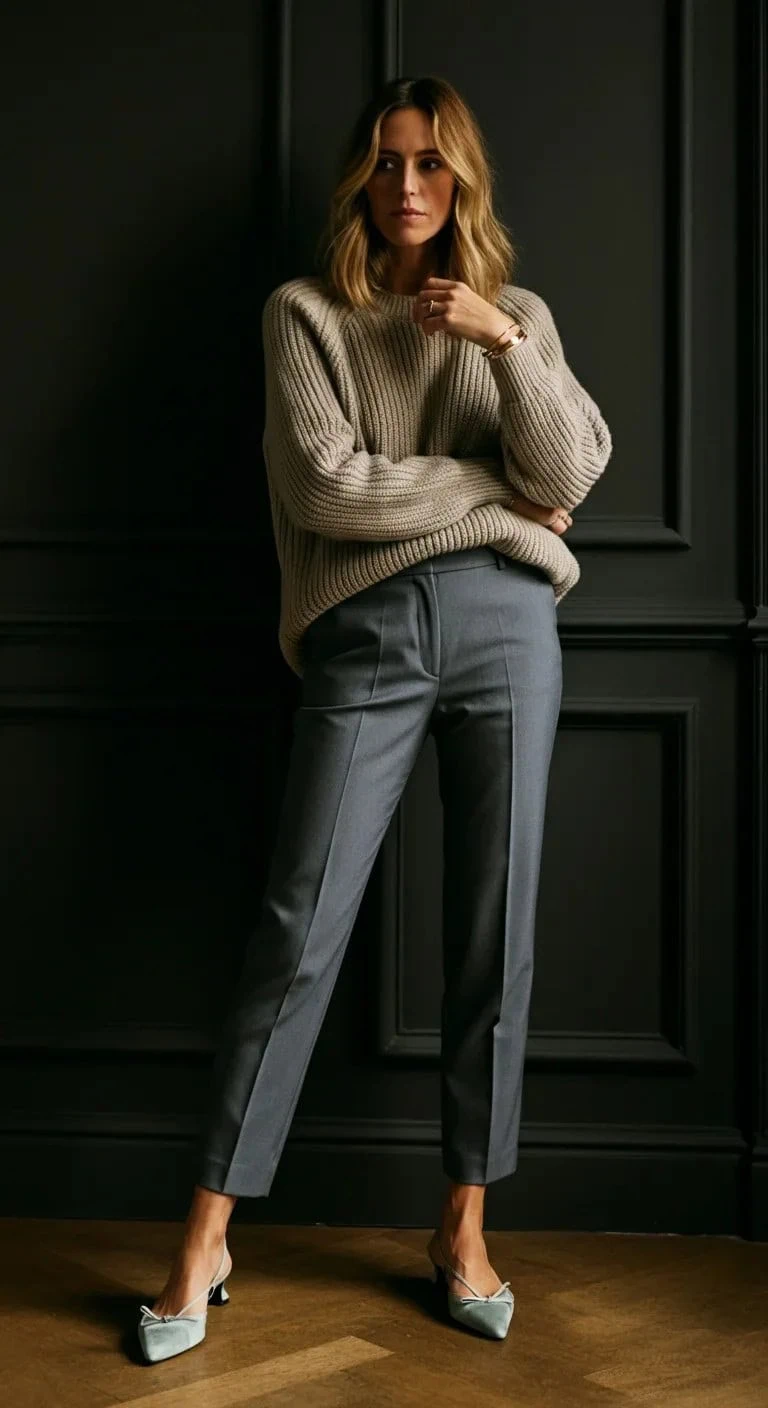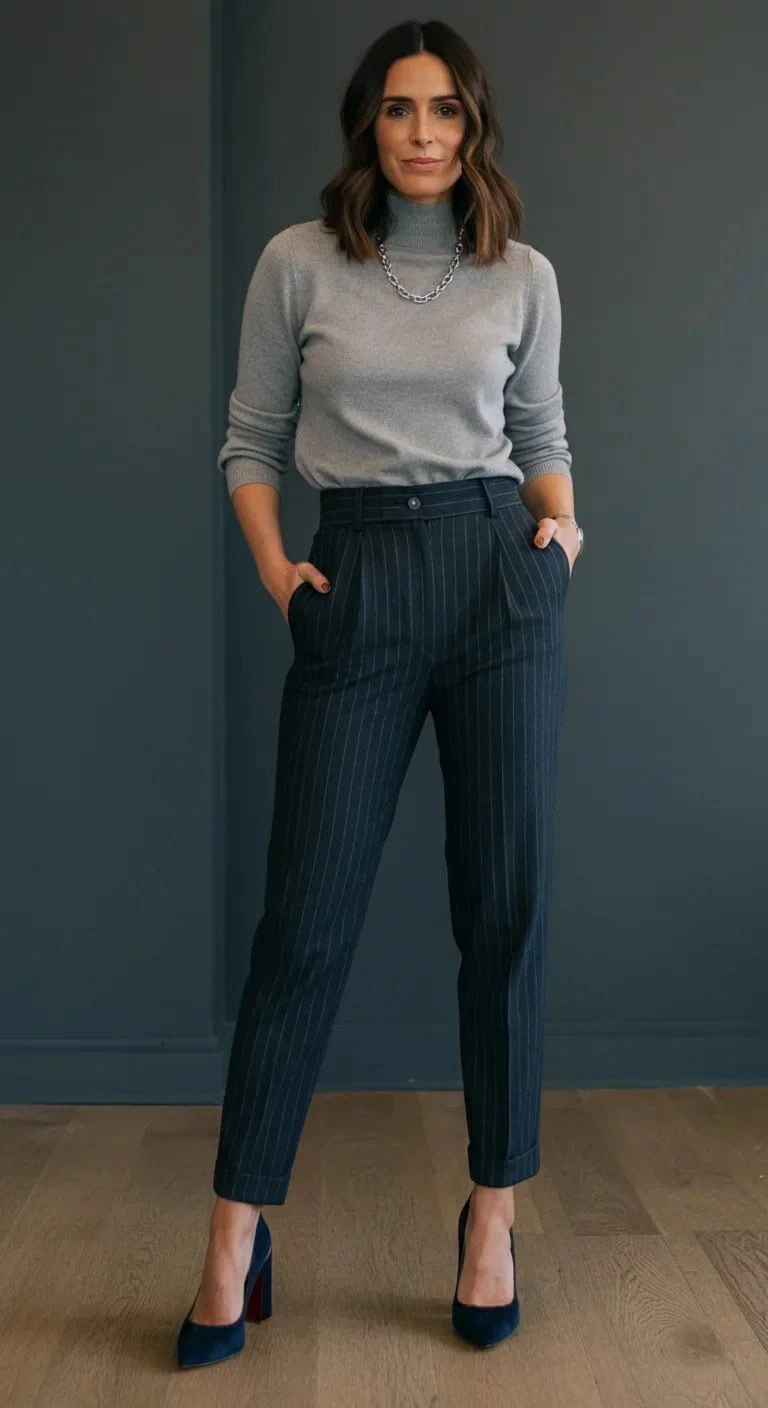 Traditional pinstripes feel modern when paired with contemporary knitwear.