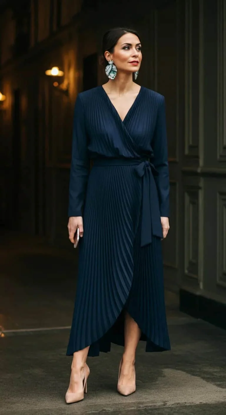 Choose a wrap dress with unique pleating or asymmetrical details.