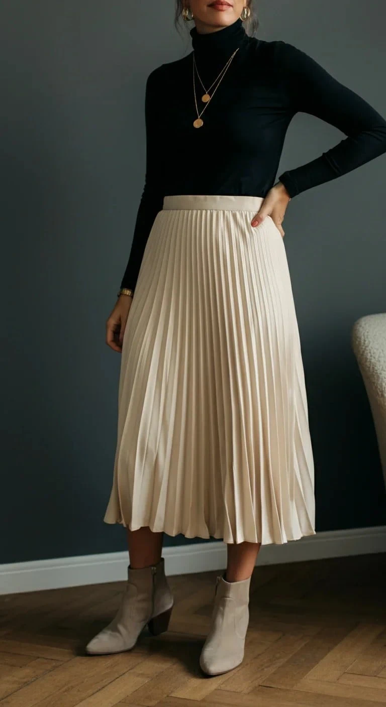 The classic pleated skirt gets a contemporary update when paired with a slim-fitting turtleneck.