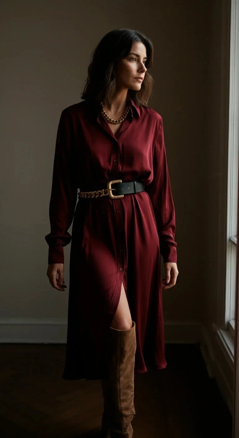 A silk shirt dress becomes instantly more structured with a wide belt.