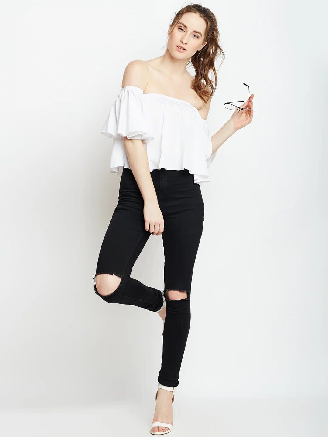 Elevate your campus style with this trendy off-shoulder top and ripped jeans combo. The flowy white off-shoulder blouse exudes a carefree vibe perfect for warm days, while the black distressed skinny jeans add an edgy touch.