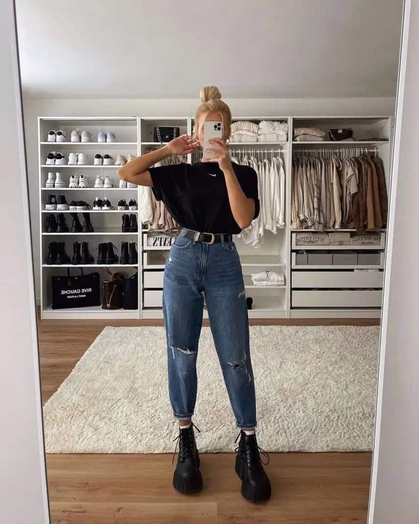 Chunky black combat boots add an edgy twist, perfect for trekking across campus. The ensemble is completed with a sleek belt, demonstrating how simple accessories can elevate a basic outfit.