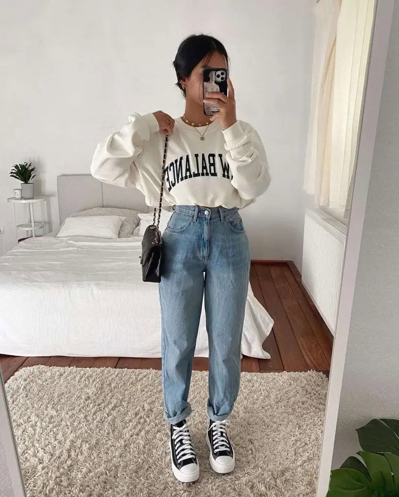 Paired with high-waisted mom jeans, it creates a trendy silhouette thats both flattering and comfortable. The black high-top sneakers add an urban edge, while the small shoulder bag keeps the outfit practical for carrying essentials.