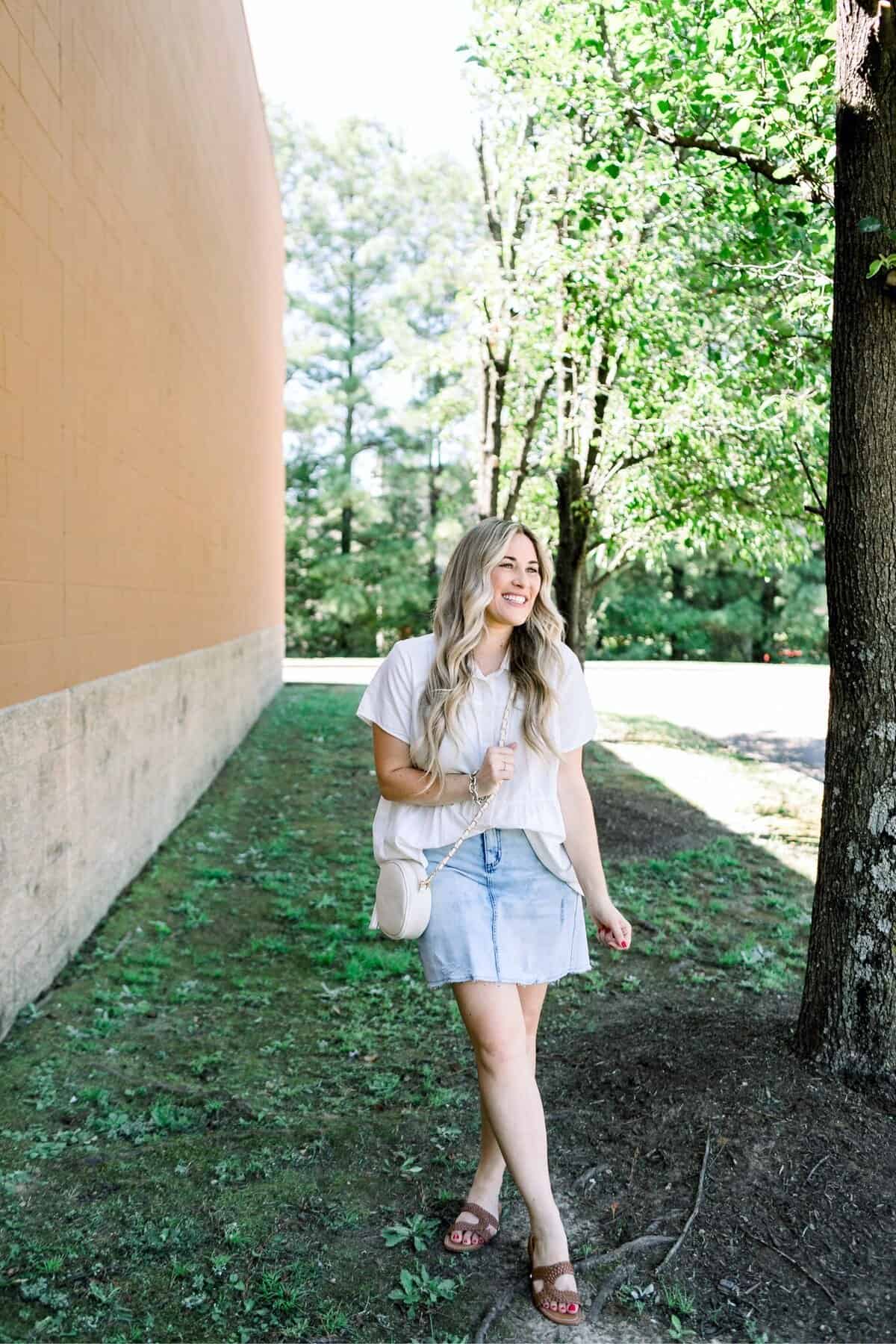 The high-low hem of the shirt adds a trendy touch, while the relaxed fit ensures all-day comfort. Nude slip-on shoes complete the ensemble with a practical yet fashionable flair.