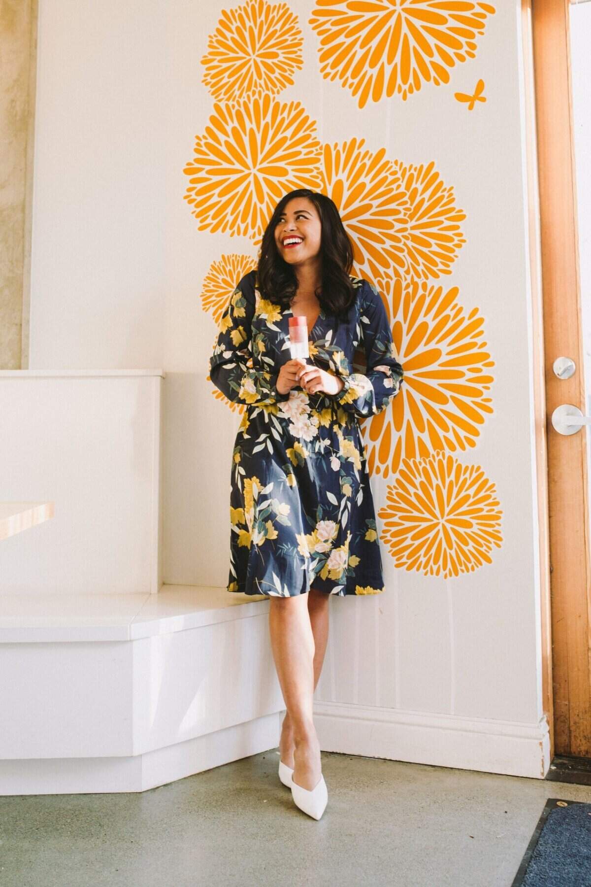 Embrace the spirit of fall with this enchanting floral wrap dress that effortlessly combines comfort and style. The navy base adorned with golden and cream blooms perfectly captures the essence of autumn, while the flattering wrap silhouette accentuates your figure. The midi length and long sleeves make it ideal for cooler temperatures, yet versatile enough for various birthday celebrations. Paired with chic white pointed-toe flats, this outfit strikes the perfect balance between casual and dressy. The vibrant orange backdrop adds a playful touch, reminiscent of fall foliage. This ensemble will undoubtedly make you the center of attention at any seasonal gathering, radiating warmth and charm.