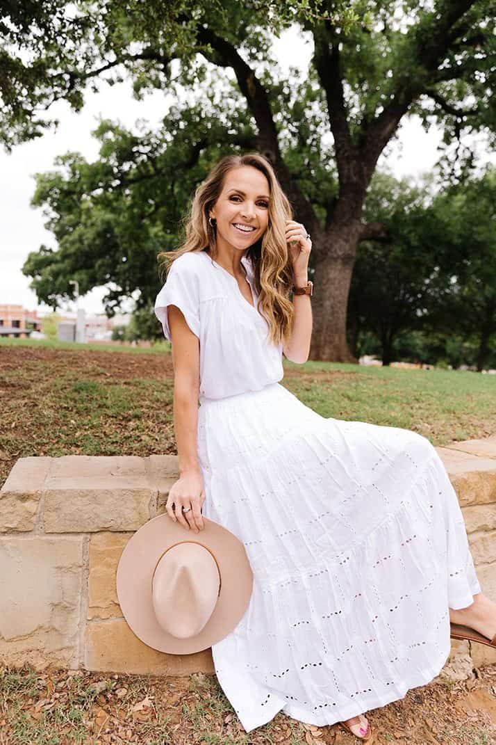 Embrace the crisp autumn air with this enchanting all-white ensemble that exudes both elegance and comfort. The flowy maxi skirt with delicate eyelet detailing adds a touch of whimsy, while the casual short-sleeved top keeps the look relaxed and birthday-party appropriate. Accessorized with a neutral wide-brimmed hat, this outfit strikes the perfect balance between boho chic and seasonal sophistication. It’s an ideal choice for an outdoor fall celebration, allowing you to twirl through fallen leaves while feeling like the belle of the autumn ball. The versatile white palette also provides a beautiful blank canvas for layering with cozy cardigans or statement jewelry as the temperature drops.