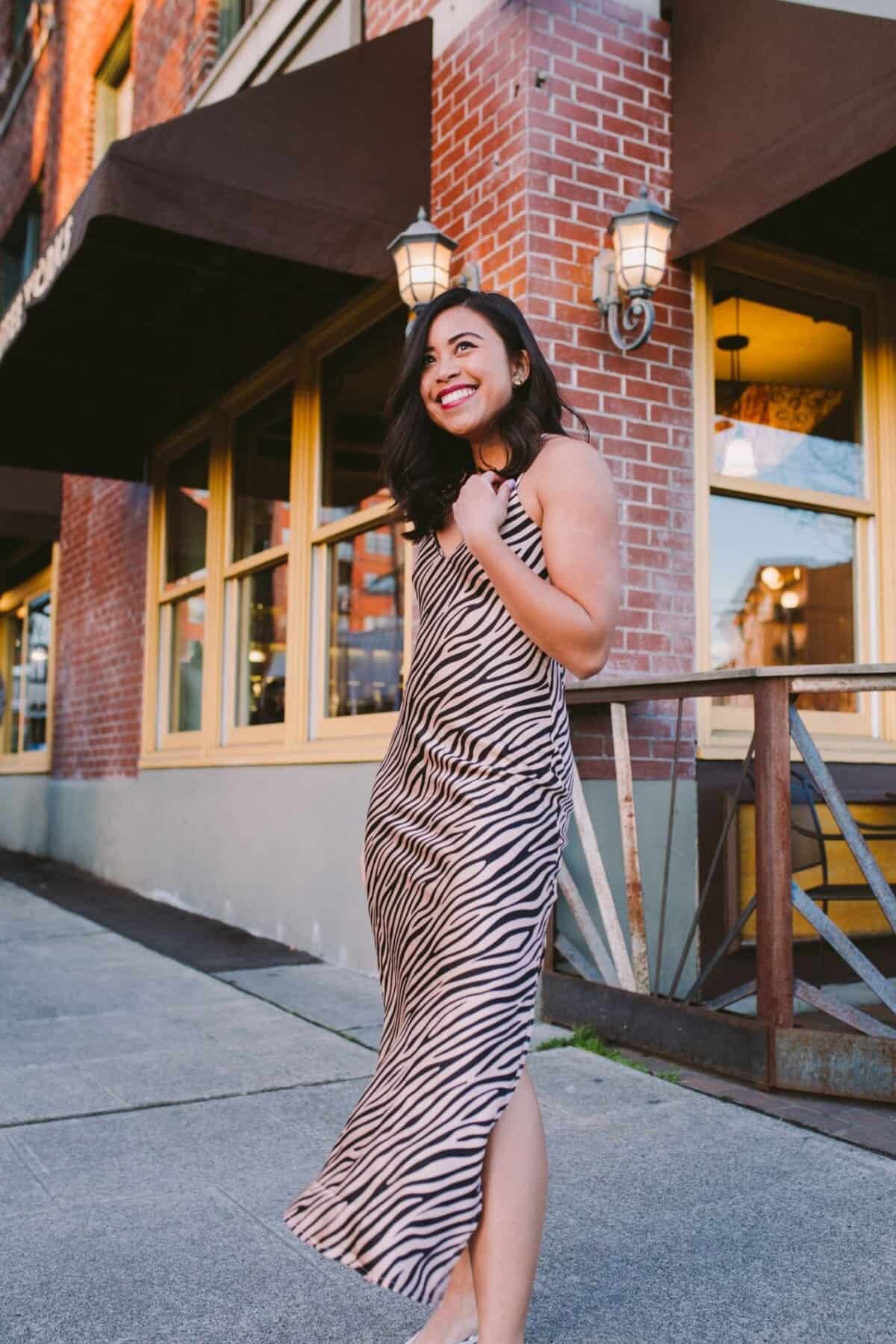 Embrace the wild side of fall with this stunning zebra print maxi dress. The sleek silhouette and eye-catching pattern make it a perfect choice for a birthday celebration that stands out from the crowd. The neutral tones of black and beige effortlessly blend with the autumn palette, while the dress’s length offers warmth for cooler evenings. Its versatility allows for easy styling – pair it with a leather jacket for an edgy look or a cozy cardigan for a softer approach. The side slit adds a touch of allure, making it ideal for both daytime gatherings and evening soirées. This dress ensures you’ll be the center of attention at any fall birthday bash.