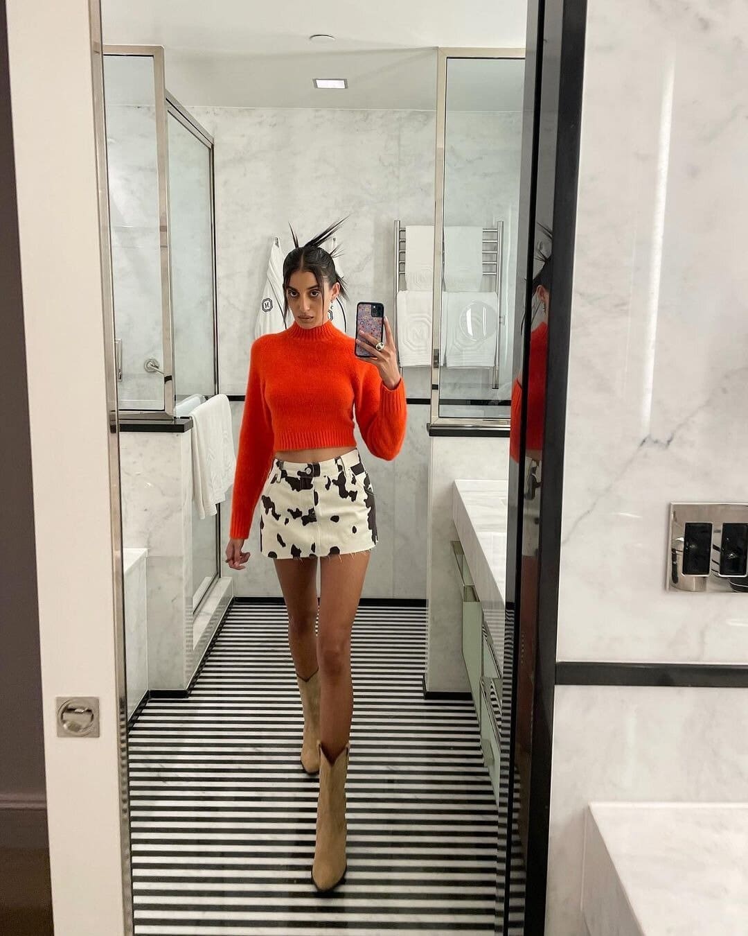 This striking fall birthday outfit combines cozy comfort with eye-catching style. The vibrant orange cropped sweater is perfect for those crisp autumn days, while its shortened length adds a playful touch. Paired with a patterned mini skirt in neutral tones, the ensemble creates a balanced look that’s both seasonal and fashion-forward. The knee-high boots in a complementary beige shade elongate the legs and add a touch of sophistication. To top it off, the unique hairstyle with spiky accents gives the outfit an edgy, celebratory feel. This look is ideal for a fall birthday girl who wants to stand out while embracing the season’s palette and textures.
