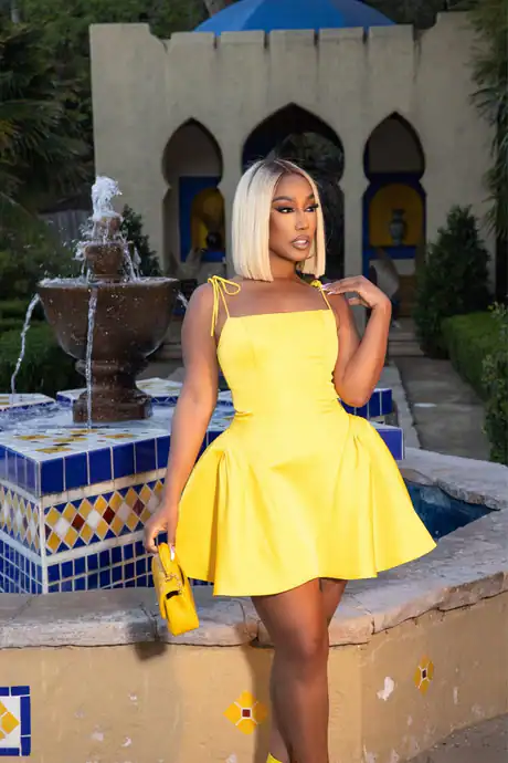 This striking outfit features a vibrant, sunshine-yellow mini dress with a structured fit-and-flare silhouette. The dress has a square neckline and thin, tied shoulder straps that add a playful, feminine detail. The flared skirt gives it a flattering, bold shape perfect for making a statement. Paired with a matching yellow handbag and heels, the monochromatic styling creates a powerful, confident look. Sleek blonde hair and flawless glam complete the ensemble, making it ideal for a summer party, upscale brunch, or any moment meant to shine.