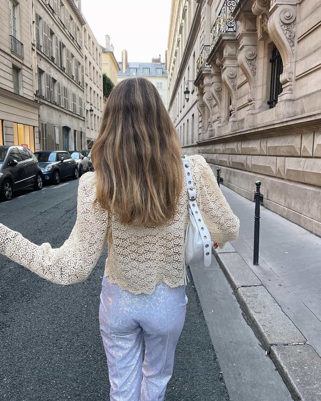 Embrace the crisp autumn air with this effortlessly elegant ensemble that perfectly balances cozy and chic. The delicate cream crochet sweater adds a touch of vintage charm while providing just the right amount of warmth for those cool fall days. Paired with shimmering lavender pants, this outfit brings a soft, dreamy quality to your birthday look. The combination of textures and gentle hues creates a romantic, ethereal vibe that’s ideal for strolling through picturesque city streets or sipping coffee at a quaint café. Accessorized with a white studded bag, this outfit exudes both sophistication and whimsy, making you the ultimate seasonal sweetheart on your special day.