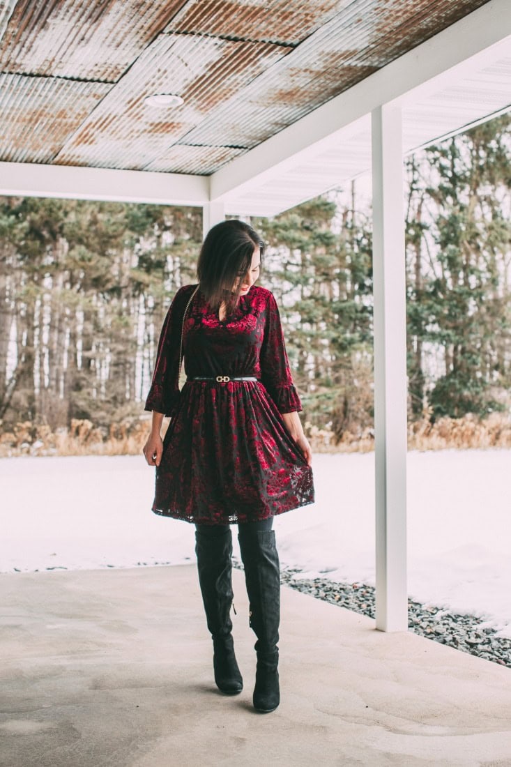 Embrace the rich hues of autumn with this stunning burgundy lace dress. The deep, wine-colored velvet exudes sophistication while the delicate lace overlay adds a touch of romance. The three-quarter bell sleeves offer a vintage-inspired flair, perfect for a fall celebration. Cinched at the waist with a sleek belt, this dress creates a flattering silhouette. Paired with knee-high boots, it strikes the ideal balance between cozy and chic. The outfit’s warm tones complement the changing leaves, making it a quintessential choice for an outdoor fall birthday gathering. You’ll feel like the epitome of seasonal elegance in this enchanting ensemble.