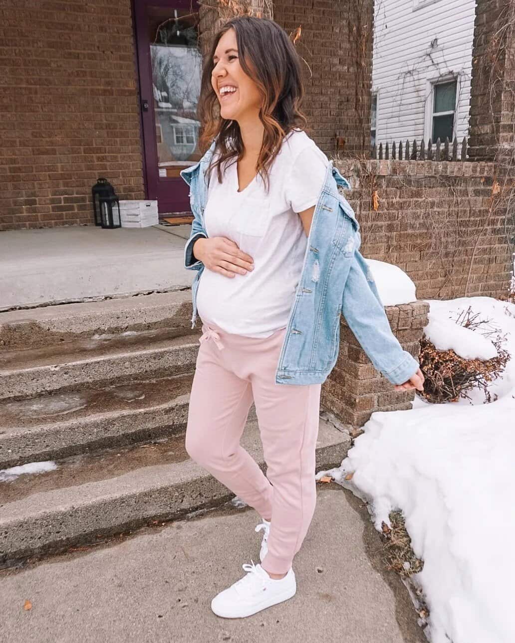 This effortlessly stylish maternity outfit combines comfort and fashion, perfect for the mom-to-be who wants to look put-together without sacrificing ease. The ensemble features a classic white tee that gracefully accommodates a growing bump, paired with soft pink joggers for a touch of feminine charm.